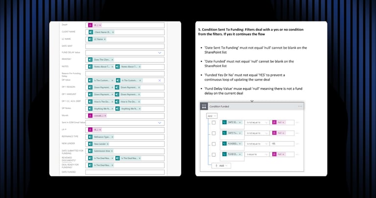 Architected and deployed a centralized digital ecosystem for an automotive refinance firm to replace paper-based processes. This solution integrated SharePoint, Power Automate, and Microsoft Forms to streamline sales-to-funding workflows and provide real-time reporting for management.